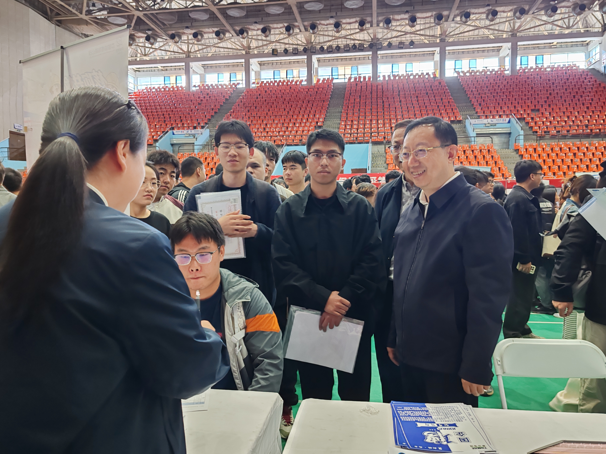 调研过程中,种宇宏逐一走访行业重点用人单位展位,与企业招聘负责人及校友亲切交谈。他详细询问企业招聘需求、岗位要求、薪资福利及行业发展情况,了解企业对我校毕业生专业能力、实践素养的综合评价,并向企业介绍我校学科建设、人才培养特色及2026届毕业生规模与专业分布情况。希望校企双方以人才供需对接为窗口,进一步深化校企合作,建立长期稳定的人才输送与联合培养机制,共同为行业发展培育优质人才。在与毕业生交流时,他关切询问同学们的求职意向、目标岗位及面试进展,倾听大家在求职过程中遇到的困惑与需求。他叮嘱同学们要结合自身专业优势与职业规划,理性选择岗位,主动与用人单位沟通,同时鼓励广大毕业生到西部去、到基层去,到祖国最需要的地方建功立业,强调要树立“先就业、再择业”的正确就业观,积极把握就业机遇,在统筹社会价值的过程中实现个人价值。