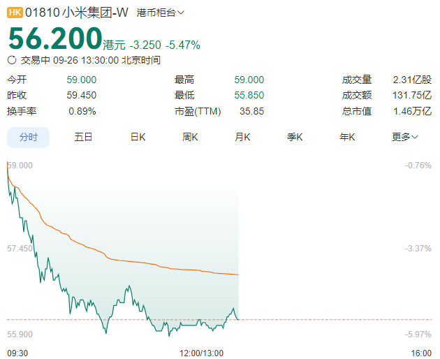 但资本市场未买账。9月26日开盘后,小米港股(持续走低,盘中跌幅超 5%,股价触及55.85港元/股。